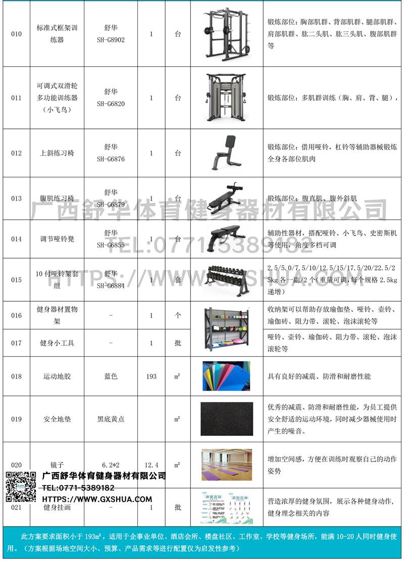 主要配置标准式框架训练器、小飞鸟、腹肌练习椅、10付哑铃套组、哑铃凳、上斜练习椅(各1台)可以实现对不同肌肉群的针对性训练,满足肌肉训练需求,全方位激活身体机能。